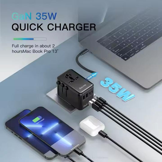 PD35W GAN All-in-One International Plug Adaptor Quick Charge GaN Universal Travel Adapter Charger with Cable