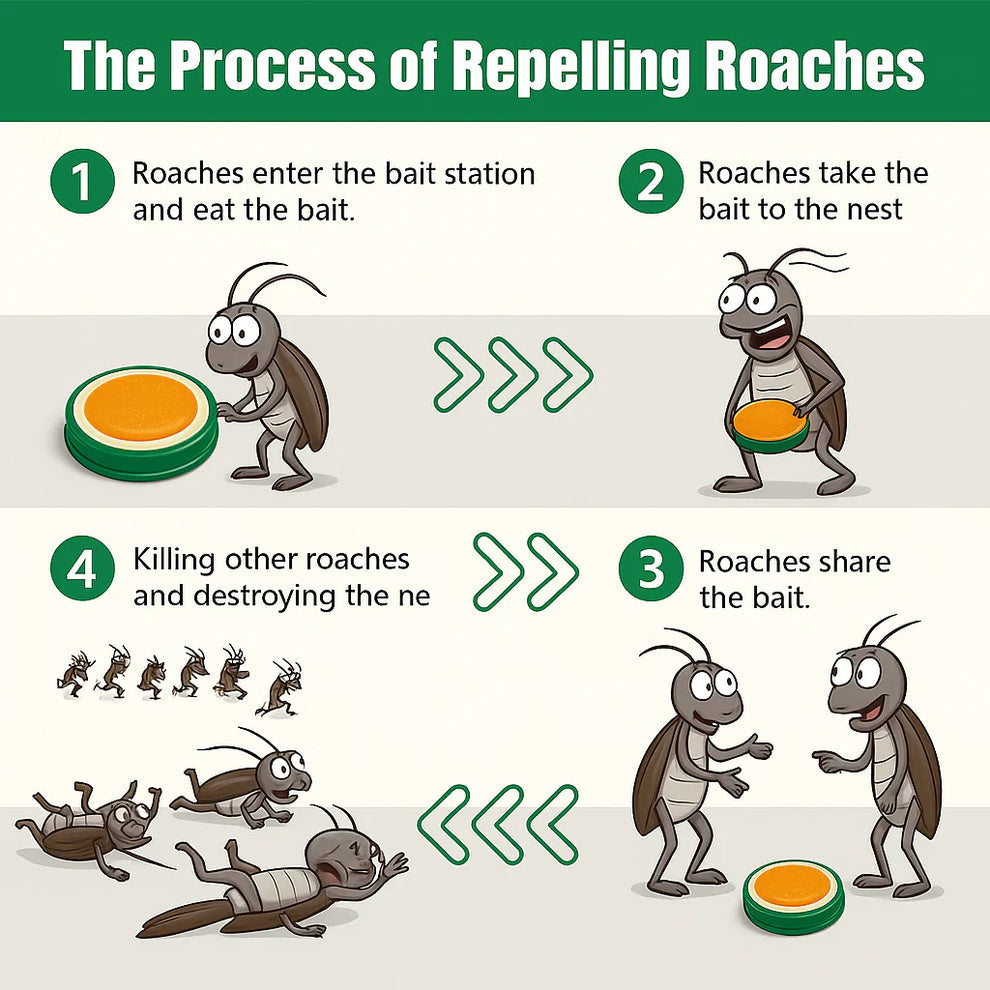 A single cockroach infects others, creating a powerful domino effect that wipes out the entire colony, including egg nests.
